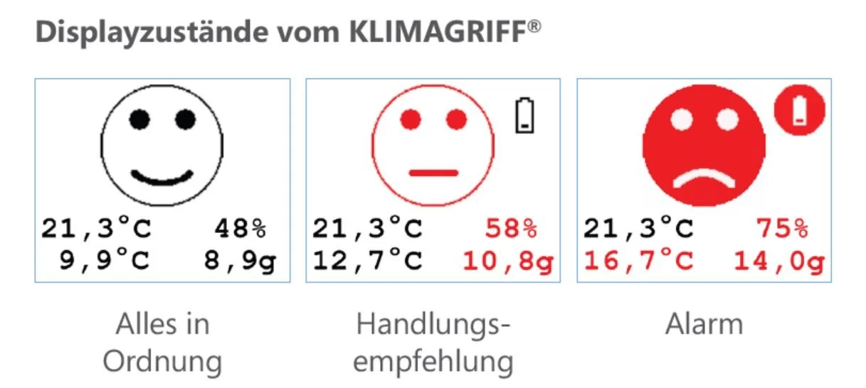 Alarmfunktion bei kritischen Werten: Bei besonders kritischen Werten, die die Gesundheit oder das Wohlbefinden gefährden könnten, schlägt der KLIMAGRIFF® Alarm, um den Nutzer rechtzeitig zu informieren.